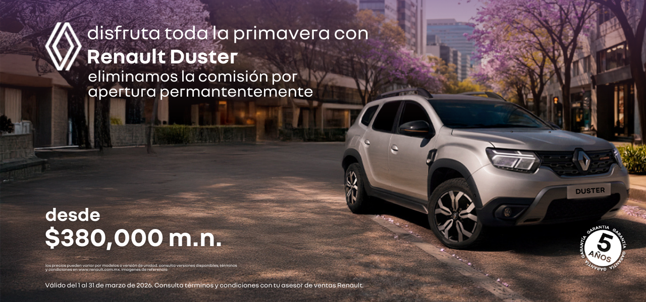 Haz que esta primavera te lleve más lejos. Estrena tu Renault Duster desde $380,000 m.n. y aprovecha esta temporada sin comisión por apertura, para que nada detenga tus planes. Con su gran espacio, altura ideal y desempeño listo para cualquier camino, es la SUV perfecta para escapadas, aventuras y días llenos de sol.