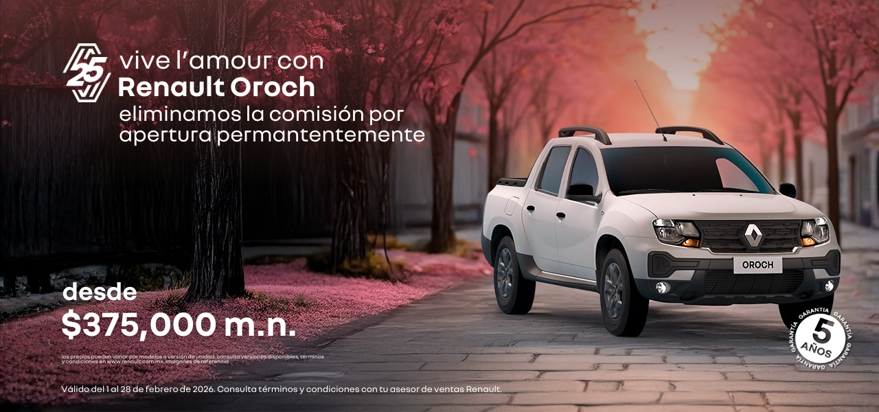 Este mes da un paso más y estrena Renault Oroch desde $375,000 m.n. Pensada para acompañarte en el trabajo, los proyectos y todo lo que viene después. Vigencia del 01 al 28 de febrero de 2026.